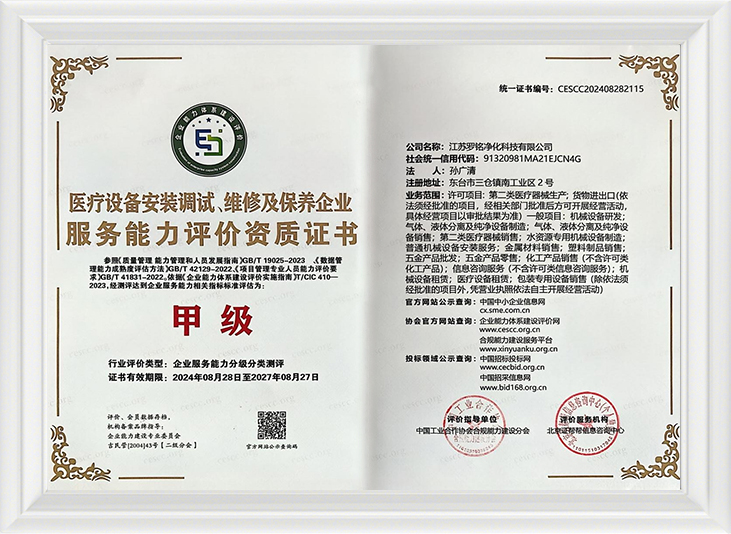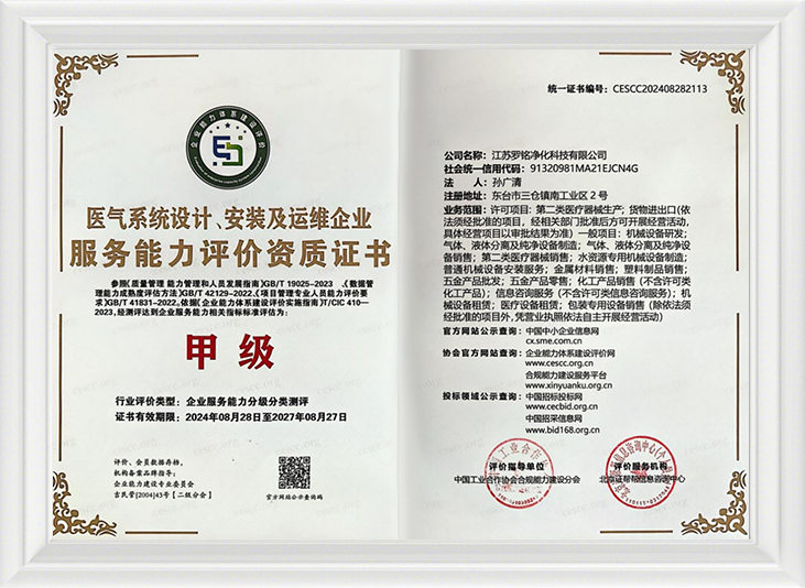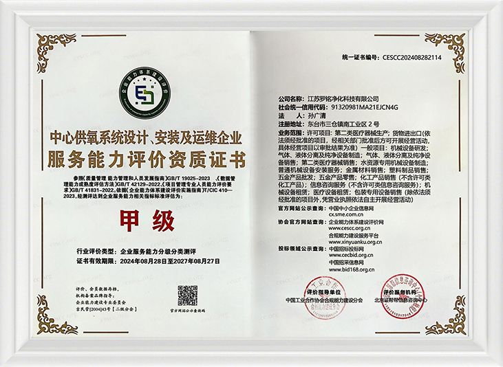 Desain sistem pasokan oksigen pusat, instalasi dan operasi dan pemeliharaan kualifikasi evaluasi kemampuan layanan perusahaan