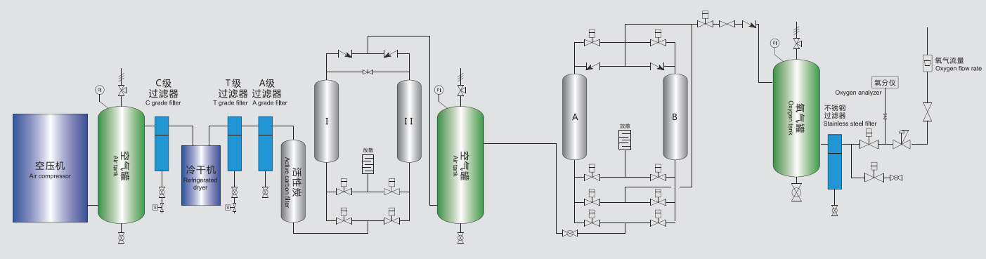 Setelah udara dikompresi oleh kompresor udara, setelah penghilangan debu, penghilangan minyak dan pengeringan, ia memasuki tangki penyimpanan udara, memasuki menara adsorpsi kiri melalui katup pemasukan udara dan katup pemasukan kiri, tekanan menara meningkat, molekul nitrogen di udara terkompresi diadsorpsi oleh saringan molekuler zeolit, dan oksigen yang tidak teradsorpsi melewati lapisan adsorpsi dan masuk tangki penyimpanan oksigen melalui katup produksi gas kiri dan katup produksi gas oksigen. Proses ini disebut hisap kiri. Durasinya sekitar enam puluh detik. Setelah proses hisap kiri berakhir, menara adsorpsi kiri dan menara adsorpsi kanan dihubungkan melalui katup pemerataan tekanan, sehingga tekanan kedua menara menjadi seimbang, proses ini disebut pemerataan tekanan, dan durasinya 3 sampai 5 detik. Setelah pemerataan tekanan berakhir, udara terkompresi memasuki tangki oksigen melalui katup pemasukan udara dan katup pemasukan kanan. Proses ini disebut hisapan kanan dan durasinya sekitar enam puluh detik. Pada saat yang sama, oksigen yang diserap oleh saringan molekuler zeolit di menara adsorpsi kiri dilepaskan kembali ke atmosfer melalui pengurangan tekanan pada katup buang kiri. Sebaliknya, jika kolom kiri teradsorpsi, kolom kanan juga ikut terdesorbsi. Untuk melepaskan sepenuhnya nitrogen yang dilepaskan dari dekompresi dalam saringan molekuler ke atmosfer, oksigen dialirkan melalui katup tiup balik yang biasanya terbuka ke menara adsorpsi desorpsi, dan oksigen di menara balik dihembuskan keluar dari menara adsorpsi. Proses ini disebut blowback, dan berjalan seiring dengan desorpsi. Setelah pengisapan kanan berakhir, masuk ke proses penyeimbangan tekanan, lalu beralih ke proses pengisapan kiri, dan lanjutkan siklusnya.