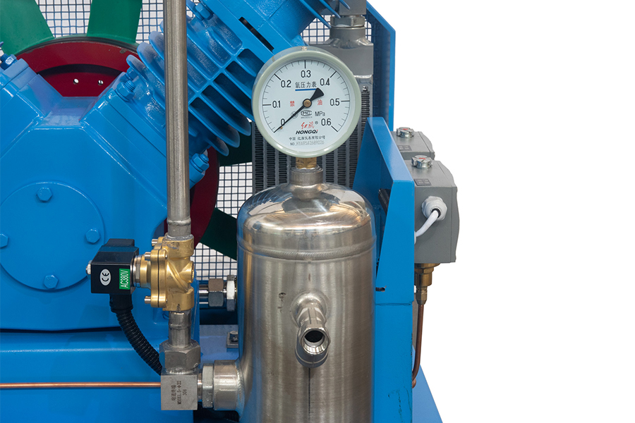 Oksigen adalah akselerator hebat yang dapat dengan mudah menyebabkan pembakaran dan ledakan. Perhatian khusus harus diberikan saat merancang dan menggunakan kompresor oksigen: dilarang keras menyentuh komponen gas terkompresi dengan oli, oli tidak terkontaminasi selama perawatan, dan harus dibersihkan dengan pelarut sebelum perakitan.